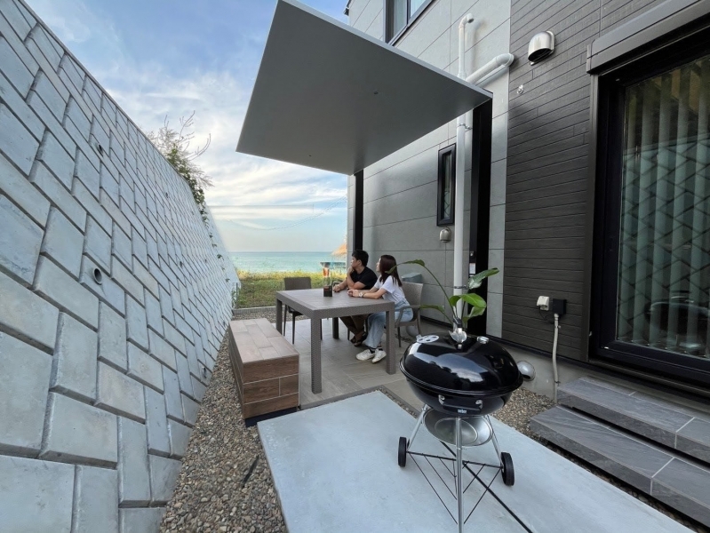 地面はタイル張りにし、ベンチや大きな屋根を設置しました。